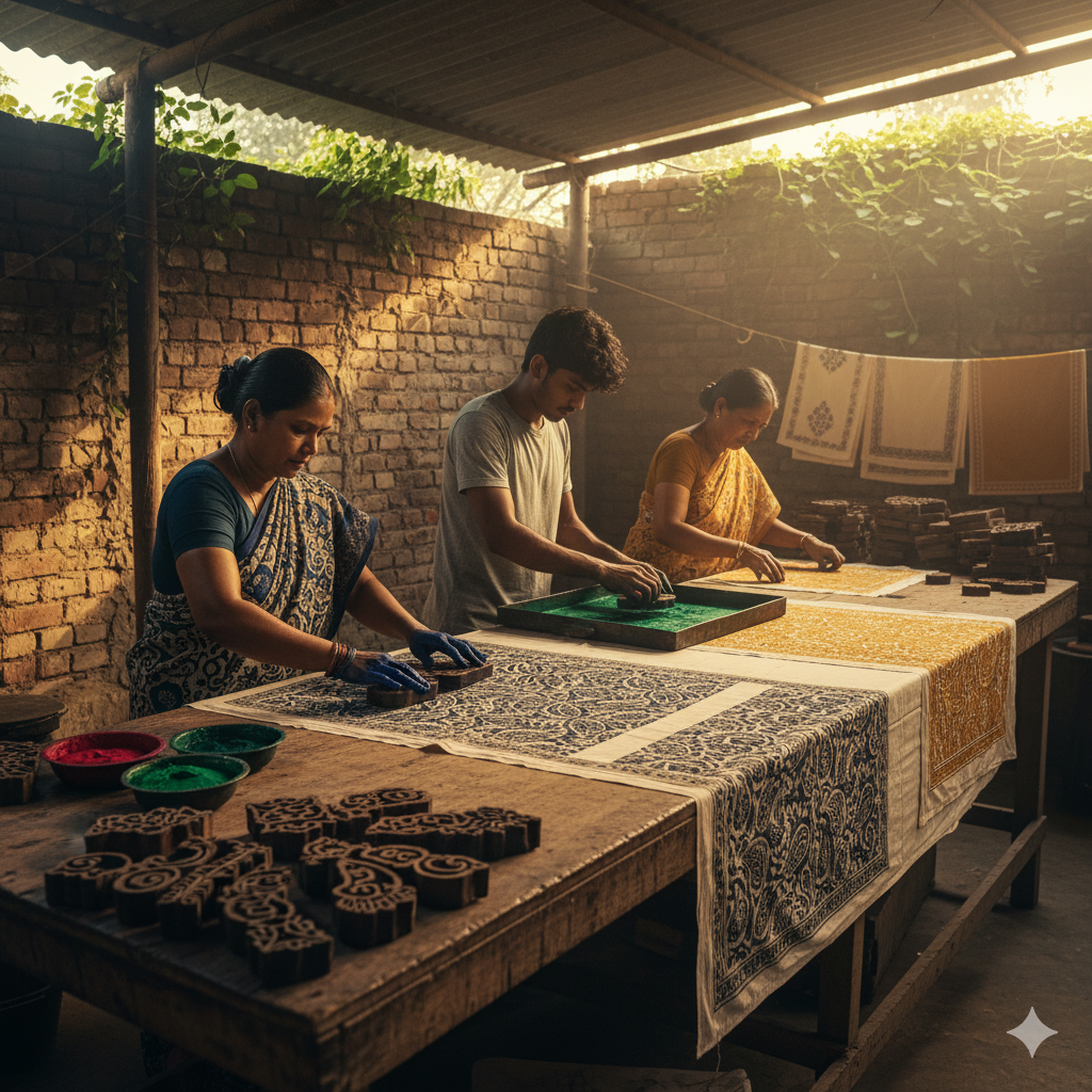 Each piece begins with a single block—carefully carved, thoughtfully inked, and pressed with precision by skilled artisans. The process is slow, intentional, and meaningful. It celebrates the purity of handwork and the quiet elegance found in subtle detail.